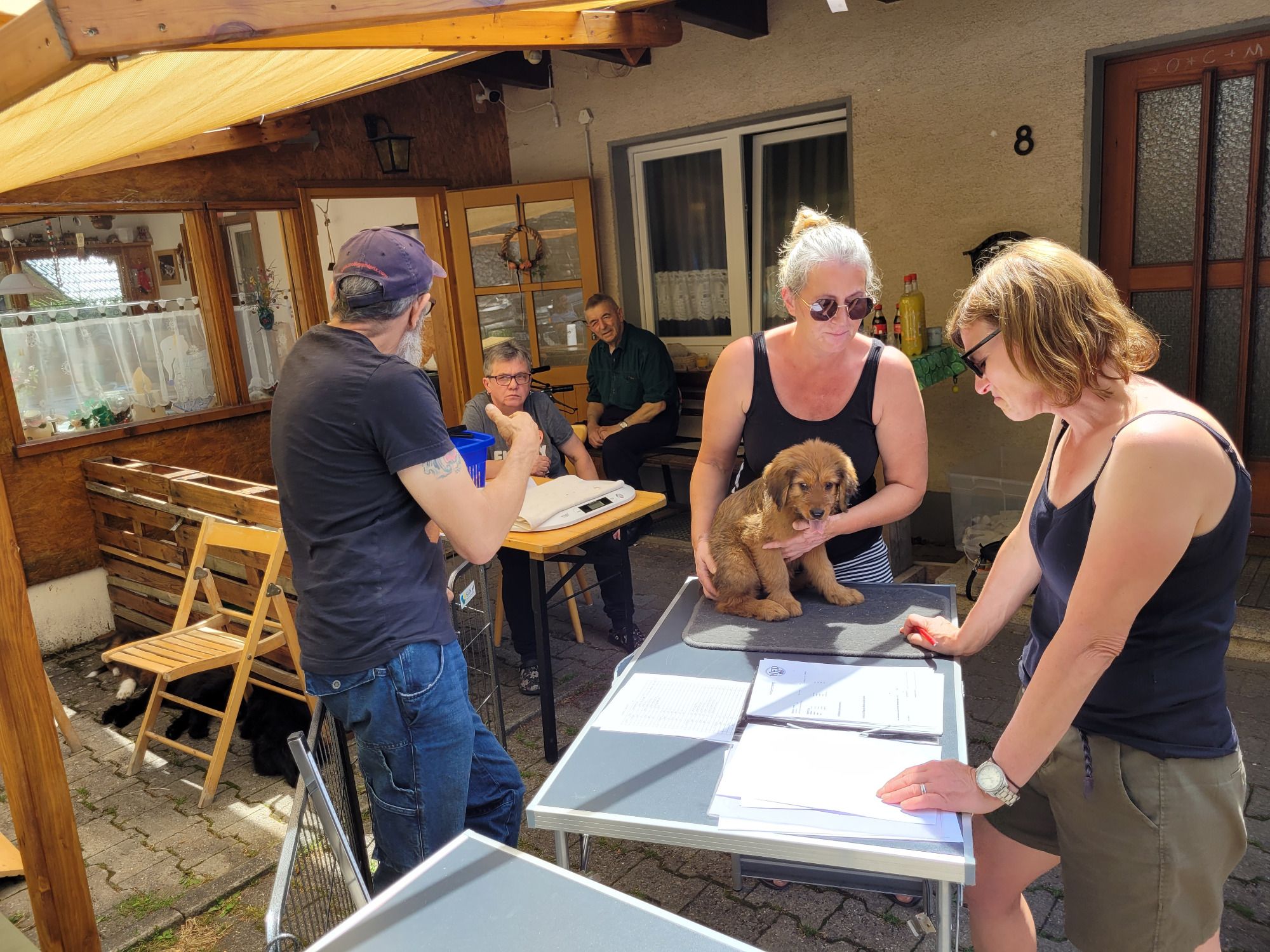 Es war soweit die siebte Woche kurz vor Vollendung. Bei schönstem Wetter konnte die Zuchtabnahme draußen im Welpenspielplatz stattfinden. Die Welpen wurden von der Zuchtleitung, vertreten durch Dino Biscalchin, Regina Burkhard und Andrea Eisele genau begutachtet. Petra Reichl sonst auch dabei war Zuschauer. Verschiedenes wie Größe, genaue Farbbenennung, Gebiss usw. wurde dokumentiert um es in der späteren Ahnentafel für jeden Welpen zu vermerken. Die Zuchtleitung war mit dem Wurf vollauf zufrieden.